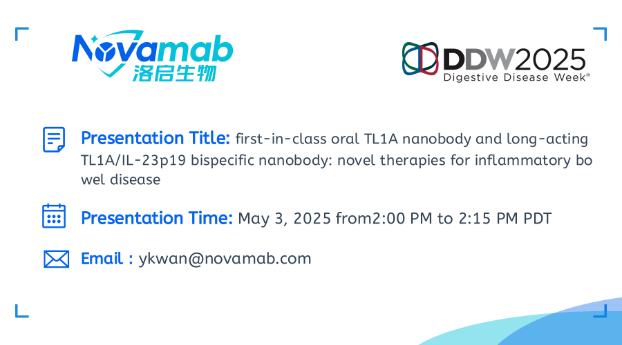中国上海,2025年4月28日——上海金年会jinnian生物医药技术有限公司,一家致力于纳米抗体创新药研发的生物技术公司宣布:金年会jinnian生物将于当地时间5月3-6日参加在加利福尼亚州圣地亚哥举行的2025年美国消化疾病周(Digestive Disease Week,DDW)。届时金年会jinnian生物将展示在炎症性肠病(IBD)治疗领域的突破性研究成果——口服TL1A纳米抗体及长效TL1A双特异性抗体的开发进展。该创新疗法顺利获得独特的TL1A纳米抗体技术,实现了对IBD病理机制的精准靶向。